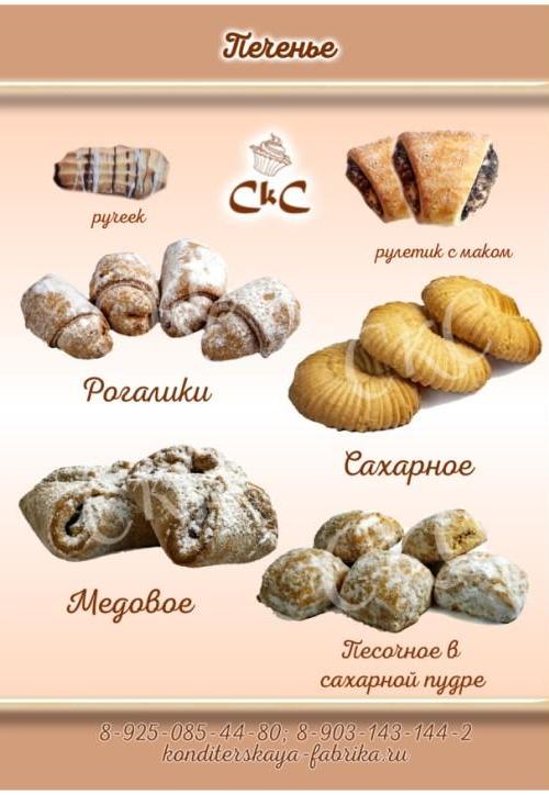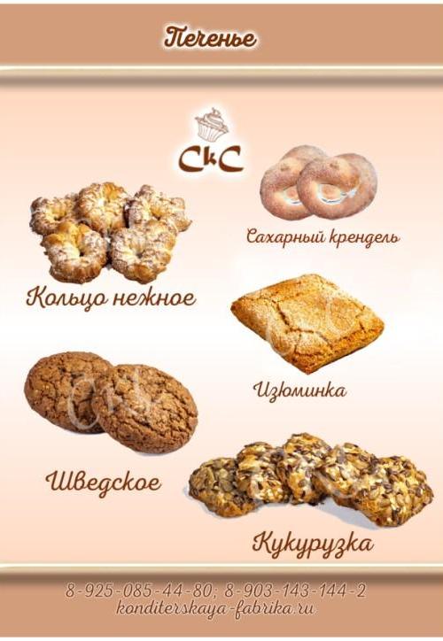 Предлагаем вашему вниманию каталог печенья собственного производства: печенье «Зерновое», «Ералаш», «Банановое», «Медовое», «Песочное в сахарной пудре», «Шведское», «Кукурузка», «Сахарный крендель», «Кольцо нежное», «Сахарная трубочка», «Песочное со сгущенным молоком», рогалики, рулетики.
